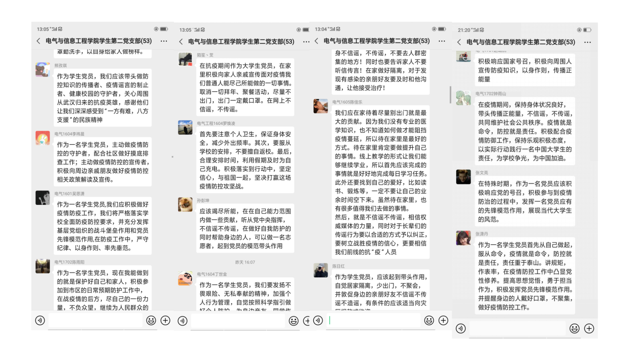 围绕“疫情期间大学生党员的责任与担当”这一话题,大家展开了积极的讨论。 “学生党员应带头做防控知识的传播者、疫情谣言的制止者、健康校园的守护者”,电气工程1603班的熊孜琪这样说。新能源1702班邹贤雅表示,每天被“最美逆行者”刷屏,在这个特殊的“长假”中收获了满满的感动,更加深刻地感受到“党员”二字的分量。电气工程1604班罗焕凌认为,学生党员要带头做好防护,减少外出,服从学校安排,不擅自返校,要善于利用假期给自己充电。大家还分享了自己身边发生的感人抗疫事迹,并表达了自己的想法。学生党员纷纷表示,虽然自己不能站斗在抗疫一线,但可以以自己的方式为抗疫贡献一份力量。