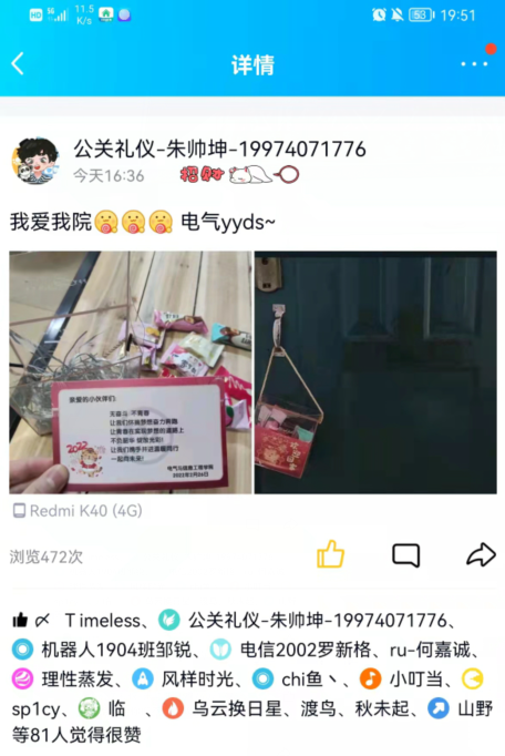 经过校门口的测量体温、入校核验等流程之后,同学们回到各自的寝室,“哇,爱意满满的小惊喜!”“暖暖的,很贴心”。看到寝室门把手上挂着的小零食和专属开学贺卡,大家被“暖”到了,纷纷点赞这温馨有爱的开学“仪式感”。