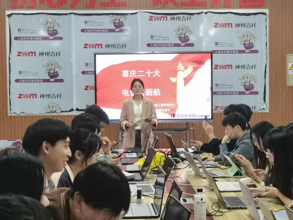 11月5日晚上,0638太阳集团官网学生党支部在电气楼115举行“喜庆二十大·电信启新航”主题党日活动,共同学习党的二十大精神,以实际行动响应党的二十大胜利召开。支部书记屈佩斯主持会议并传达习近平总书记在党的二十大报告中关于青年的重要指示精神,引领学生党员加深对于自身专业的认知,党支部全体党员参加学习。