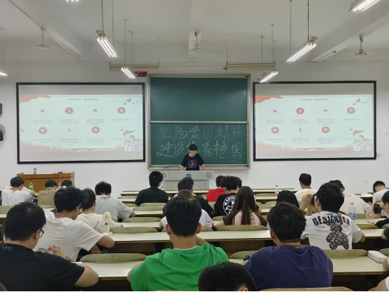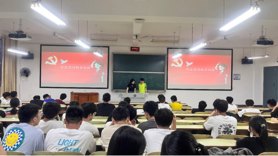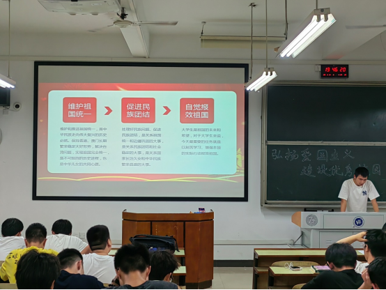 主讲人张依琪以讲述和播放爱国视频相结合的方式向同学们展示了中国百年来沧海桑田和伟大成就,向同学们介绍了学校优势和相关特色。生逢盛世,肩负重任,同学们深刻认识到作为一个新时代青年肩负起怎样的重任。班会最后的影视片段更是将同学们的爱国爱校情怀推至到高峰。
