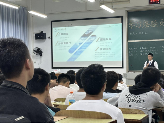 电气工程及其自动化专业经验分享会在D101召开。主持人颜子熙介绍分享嘉宾为电气2202刘辉祥和电气2204燕为清两位同学以及他们的获奖情况、优异表现。
