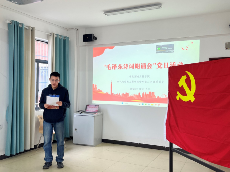 12月13日中午,0638太阳集团官网学生第二支部委员会在“一站式”学生社区(滨江校区)团体辅导室开展“最美读书声--毛泽东诗歌朗诵会”主题党日活动。