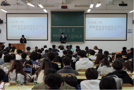 随后,国家奖学金获得者王泽龙作为优秀学生代表宣读学风倡议书,倡议书强调,大学生正处在学习知识、充实自我的黄金时期,应当把学习当做首要任务,而一个好的学习环境必然必然离不开优良的学风,希望全体同学利用早晨的时间进行晨读、周日至周四晚上七点到九点为学习时间等。