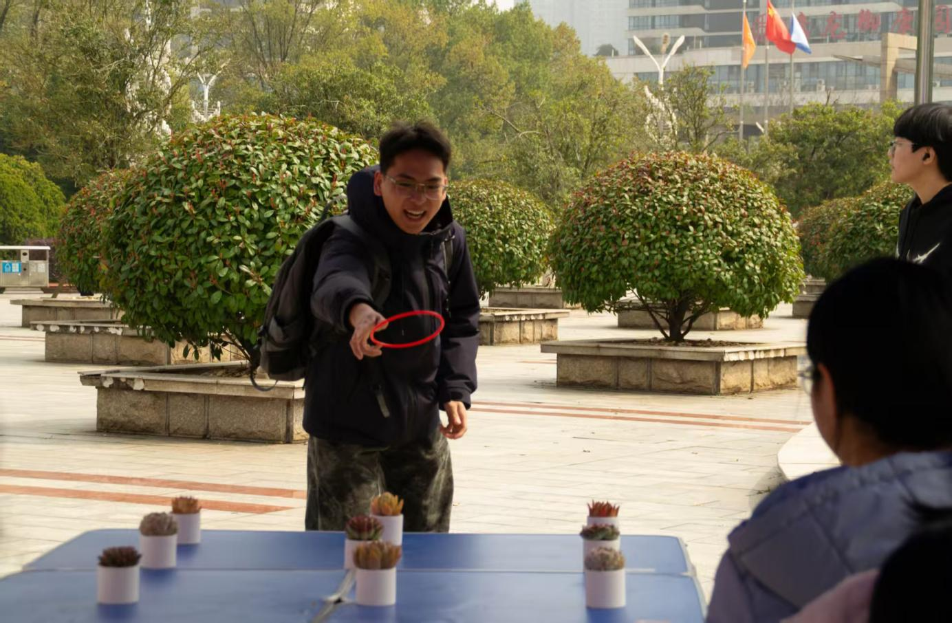 最热闹的当属套圈赢绿植区,多肉、小盆栽等礼品整齐排列,大家手持套圈屏息凝神,瞄准目标奋力一掷,套中时欢呼声此起彼伏。一位同学捧着套中的绿萝笑道:“既收获了知识,又带回了春天的礼物!”