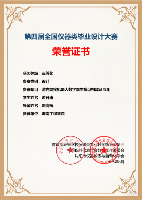 6月10日,由教育部高等学校仪器类专业教学指导委员会、中国仪器仪表学会教育工作委员会、沈阳市仪器仪表与自动化学会主办,重庆大学承办的第四届全国仪器类毕业设计大赛落下帷幕。由0638太阳集团官网宋凯林老师指导自动化2021级颜宇完成的“基于STM32L0的电池管理系统的研究与设计”获得二等奖,刘海桥老师指导自动化2021级洪升涛完成的“激光焊接机器人数字孪生模型构建及应用”获得三等奖,学院获得团体三等奖。