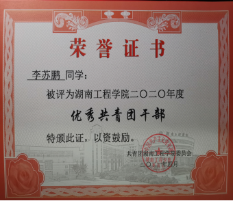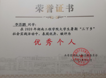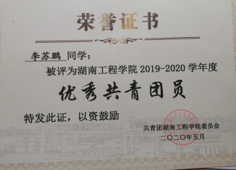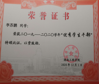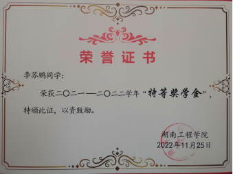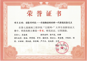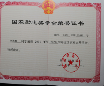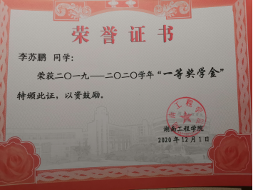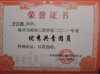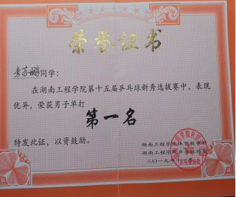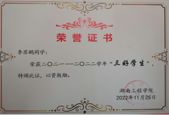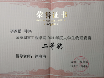 在校期间多次参加各类学科竞赛。荣获第四届CRH杂交水稻杯机器人创客大赛湖南省“二等奖”,学校“互联网+”创新创业大赛“一等奖”,学校大学生物理竞赛“二等奖”。不仅如此,“国家奖学金”、“国家励志奖学金”、“校特等奖学金”、“校一等奖学金”、“优秀青年志愿者”、“最美疫情防控志愿者”、“三下乡”社会实践“优秀个人”等奖项。