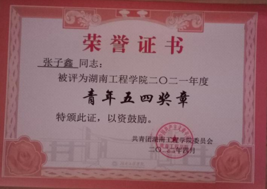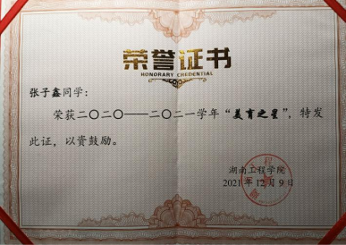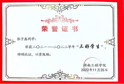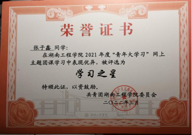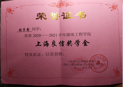 “夯实基础,稳扎稳打,才能追求卓越”。张子鑫一直秉持这个信念,在学业上勤奋学习、勇于突破。她曾获上海良信奖学金、二、三等奖学金、第四届CRH杂交水稻机器人创客大赛一等奖、湖南工程学院2020年大学生电子设计竞赛三等奖等荣誉。在社会实践方面,结合专业知识,切实做出实际贡献,曾有6篇报道登上中国青年网等主流媒体网站。
