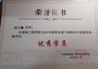 她带头树立先锋模范,争当优秀团员,曾获优秀共青团干部、团干部培训优秀学员、美誉之星。带领班级团支部成员及青年,不断加强团的基层组织建设,推进班级团内各项事务有序快速发展,将班级团支部建设成有凝聚力、积极向上、充满活力的团支部。在团中央基层建设部指导的、中国青年报主办的2020-2021学年高校活力团支部遴选活动中,经过层层推选,最终被确定为“2020-2021学年高校活力团支部”,班级团支部建设典型经验被中国青年报等官方主流媒体报道宣传。